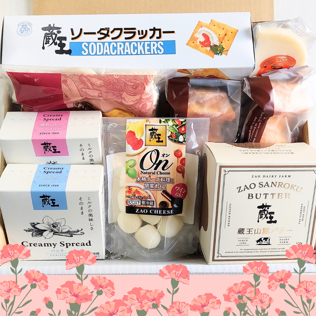 ●内容量/蔵王クリーミースプレッドバニラ・仙台いちご各100g、蔵王山麓バター170g、シュレッドチーズ180g、ゴーダ100g、ON70g、クラッカー210g、蔵王樹氷バウム×2個